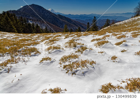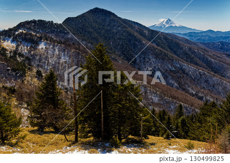 シカに食害された木、大菩薩峠、富士山遠望