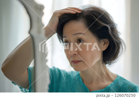 鏡の前で白髪を気にする中年アジア人女性のリアルな表情のクローズアップ