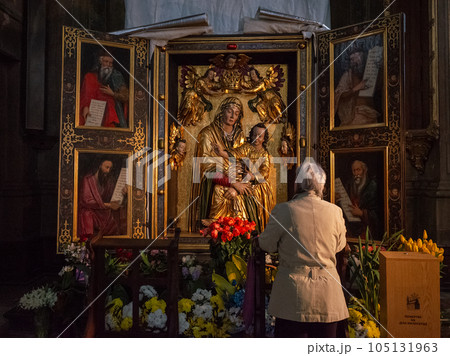 【ウクライナ】リヴィウにある聖ペテロ聖パウロ教会内の聖人像の前で祈る人の後ろ姿