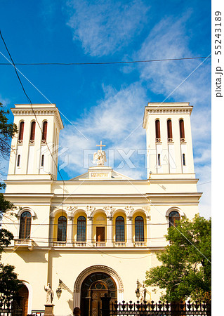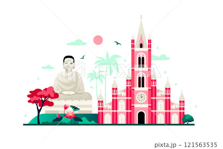 Tan Dinh Church and buddha statue - modern colored vector illustration