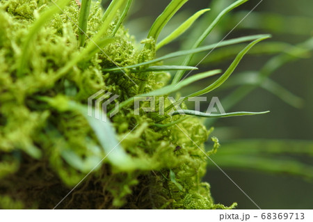 森の緑 ハイゴケの塊から生えて来た細長い植物の葉