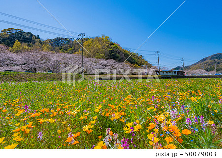 静岡県賀茂郡松崎町 田んぼをつかった花畑と那賀川の桜