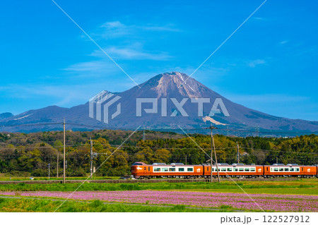 春の大山とレンゲ畑と特急やくも5 鳥取県西伯郡伯耆町