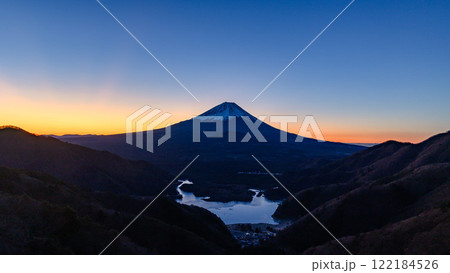 (山梨県)三方分山から見る朝焼けの富士山と精進湖の絶景
