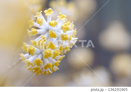 春の光に咲くミツマタの花と柔らかな背景
