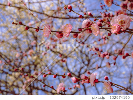 新春を告げる満開の清楚でかわいいほんのり淡いピンクの紅梅