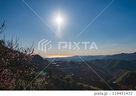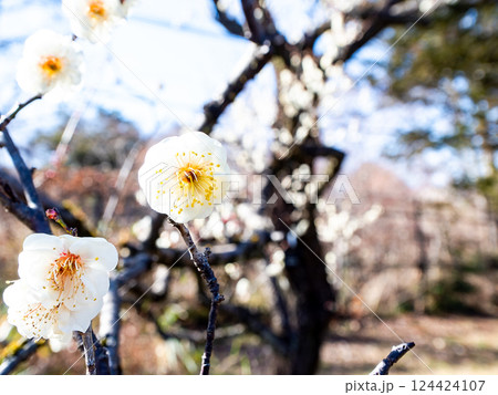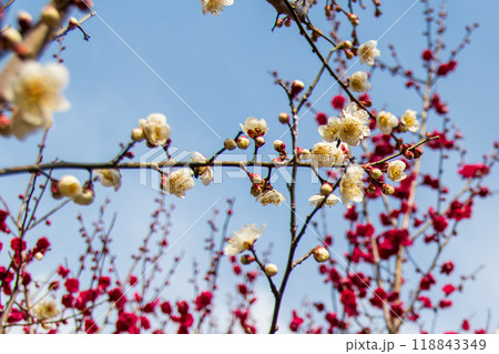 春の訪れを告げる満開の清楚な白梅 紅梅を背景に