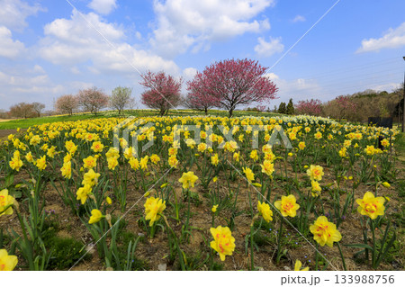 国営備北丘陵公園の春景 青空と桃の花と水仙畑