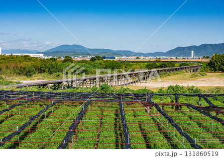 木津川河川敷の茶畑 上津屋橋(流れ橋) 京都府八幡市