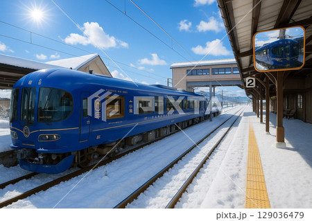 雪景色の天橋立駅に停車中の特急はしだて TANGO NO UMI