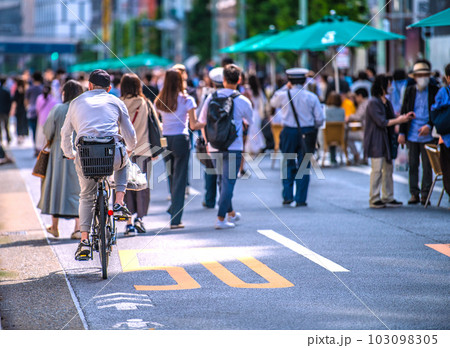 日本の東京都市景観 ホコ天を疾走する自転車。3.11の銀座。歩行者天国には多くの人出…=3月11日