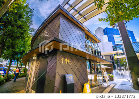 日本の東京都市景観 池袋駅前の池袋西口公園・グローバルリングやカフェ、トイレ。防犯カメラも…=7日