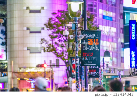 日本の東京都市景観 渋谷スクランブル交差点から街角の防犯カメラなどを望む
