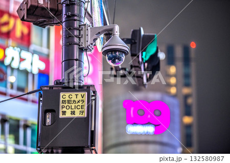 日本の東京都市景観 街角の防犯カメラ。渋谷スクランブル交差点のCCTV防犯カメラPOLICE警視庁