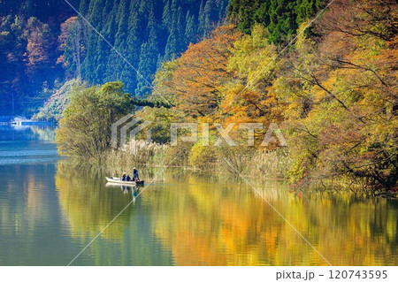 只見線早戸駅から望む秋の「霧幻峡の渡し」(福島県三島町、11月中旬午前)