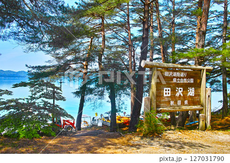 新緑の秋田県仙北市にある田沢湖、その湖畔に建つ田沢湖の看板