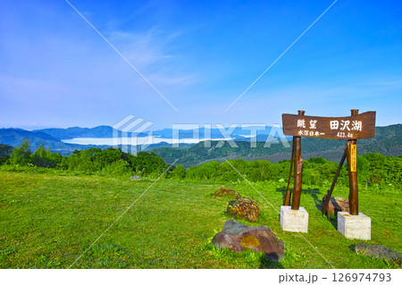 新緑の秋田県仙北市にある田沢湖の遠望、早朝の幻想的な雲海を抱く田沢湖と看板