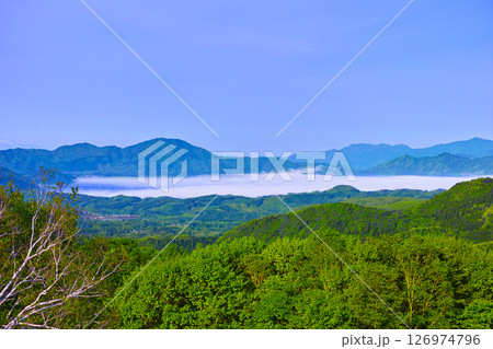 新緑の秋田県仙北市にある田沢湖の遠望、早朝の幻想的な雲海を抱く田沢湖