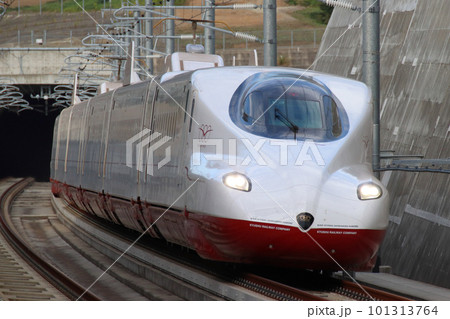 朝の武雄温泉駅に停車中の西九州新幹線N700S系車両