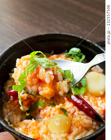 コチュジャン風味の韓国風ピリ辛リゾットと大葉のトッピング