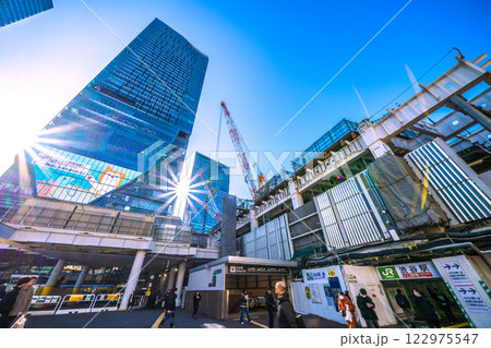 日本の東京都市景観朝の光…移転ハチ公改札…新出入口…渋谷駅…新時代に希望の光=令和7年2月15日
