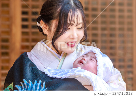 我が子を見つめる母親 お宮参り