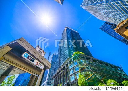 日本の東京都市景観 東京メトロ丸ノ内線東京駅(出入口M10)やハロ、丸の内のビル群を望む