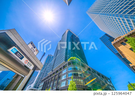日本の東京都市景観 7月。猛暑…東京・丸の内のオフィス街。左は新丸ビル。(画面右方向は大手町)
