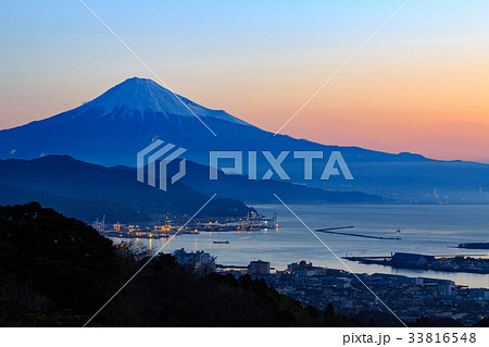 夕日に染まる富士山と清水港 静岡県静岡市清水区日本平にて