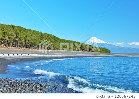 三保松原 日本三大松原と青い海の白波越しに雄大な富士山を望む 世界文化遺産 日本新三景 国の名勝