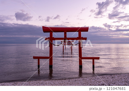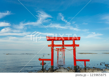 佐賀県太良町 朝の有明海の浅瀬に立つ秋の海中鳥居