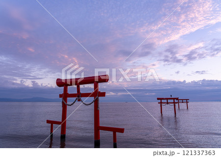 佐賀県太良町 朝の有明海の浅瀬に立つ秋の海中鳥居で夜明けを眺めるカップル