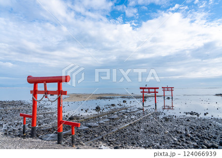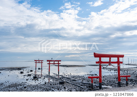 佐賀県太良町 干潮時の有明海の浅瀬に立つ秋の海中鳥居