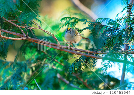 針葉樹の木の中で餌を探して飛ぶキクイタダキ