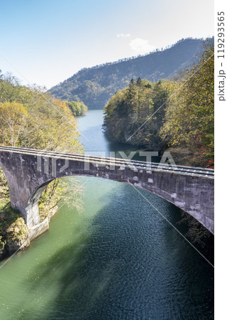秋晴れの日の旧国鉄士幌線タウシュベツ川橋梁 北海道上士幌町