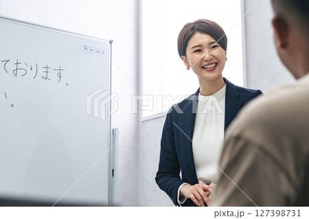 黒人男性に日本語学校でビジネス用語を教える女性教師