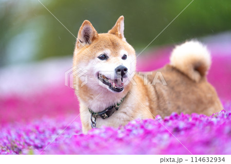 柴犬の花が咲く野原で遊ぶ 芝桜背景に柴犬 公園で遊ぶ柴犬 かわいい柴犬