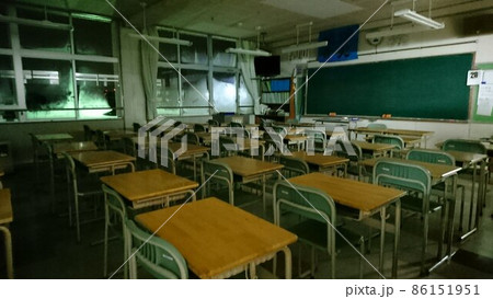 ぼんやり明かりが差し込む誰もいない教室の夜