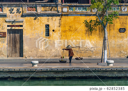 ホイアンの街並みと、ノンラーを被るベトナム人