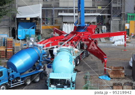 マンション建設現場の生コンミキサー車とコンクリートポンプ車