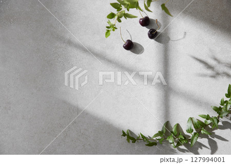 A cozy backdrop with fresh fruits and grass on a table with natural sunlight and shadows.