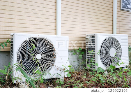 住宅外壁前に並ぶ2台のエアコン室外機と雑草の風景