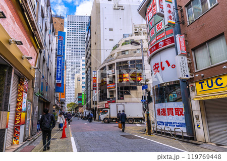 日本の東京都市景観 新宿西口の飲み屋街。奥のオフィス街などに出勤する人達…=21日