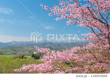 残雪の日高山脈と桜が美しい春の十勝平野