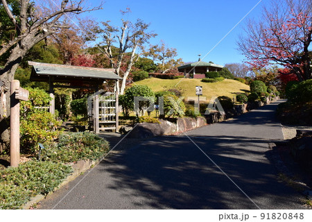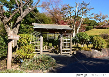 神奈川県立大磯城山公園 旧三井別邸地区の亀蔵門と展望台と紅葉