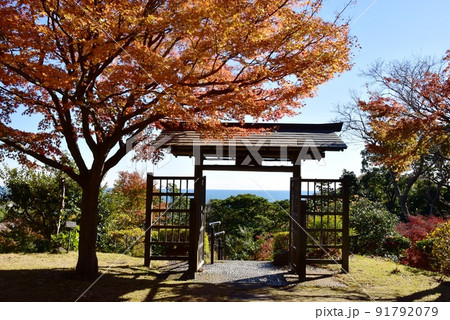 神奈川県立大磯城山公園 旧三井別邸地区ひかりの広場の法雲堂門と相模湾眺望