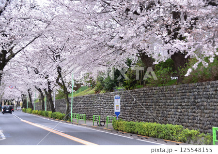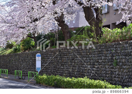 世田谷・千歳通りの桜並木・笹原小学校前のバス停と玉石垣