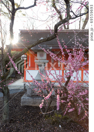 梅宮大社の春、春の日差しを受ける本殿と紅梅