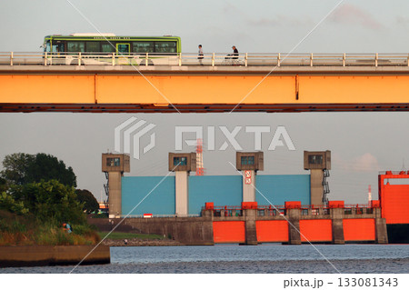 新荒川大橋を渡る国際興業バスと岩淵水門(埼玉県川口市)