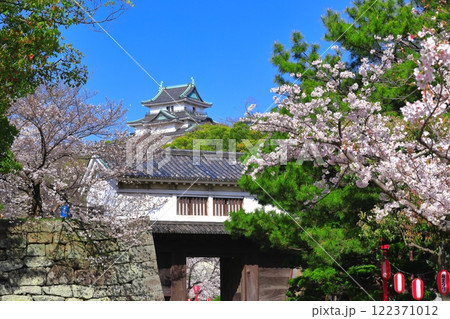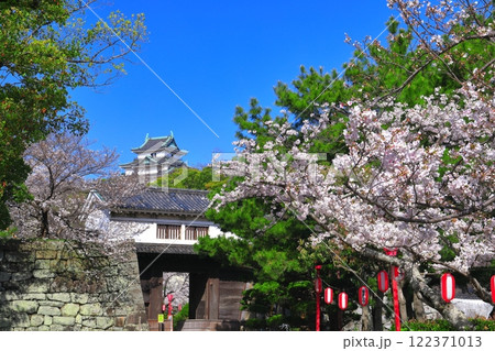 【和歌山県】満開の桜と和歌山城の天守閣と岡口門